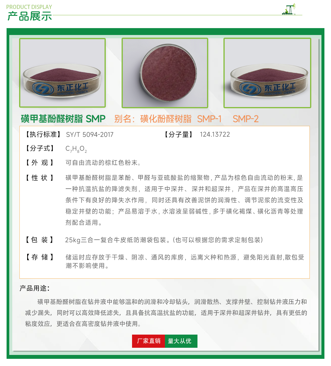 磺甲基酚醛树脂在钻井液中能够温和的润滑和冷却钻头,润滑散热、支撑井壁、控制钻井液压力和减少漏失,同时可以高效降低滤失,且具备抗高温抗盐的功能,适用于深井和超深井钻井,具有耕地的粘度效应,更适合在高密度钻井液中使用。